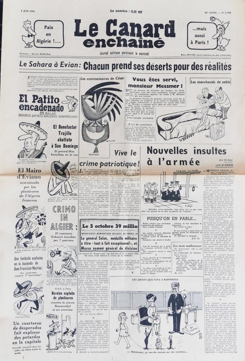 Tous nos journaux du canard enchaîné de 1961 sont des documents historiques qui proviennent de nos propres archives de presse ancienne. Ils ont été récupérés auprès d'institutions telles que les bibliothèques, musées ou collectionneurs privés. Aucune reproduction ni photocopie numérique . S'agissant d'un titre de presse hebdomadaire paraissant le mercredi, vous recevrez donc le journal le canard enchaîné édité la semaine de la date de naissance demandée en 1961.